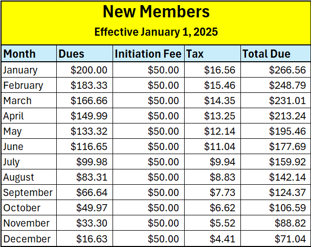 - Annual dues for existing members are $213.25 - this is $200 plus 6.625% NJ Sales Tax of $13.25 Membership is for the CALENDAR year, January 1st to December 31st. Dues are payable BEFORE the first of each year.